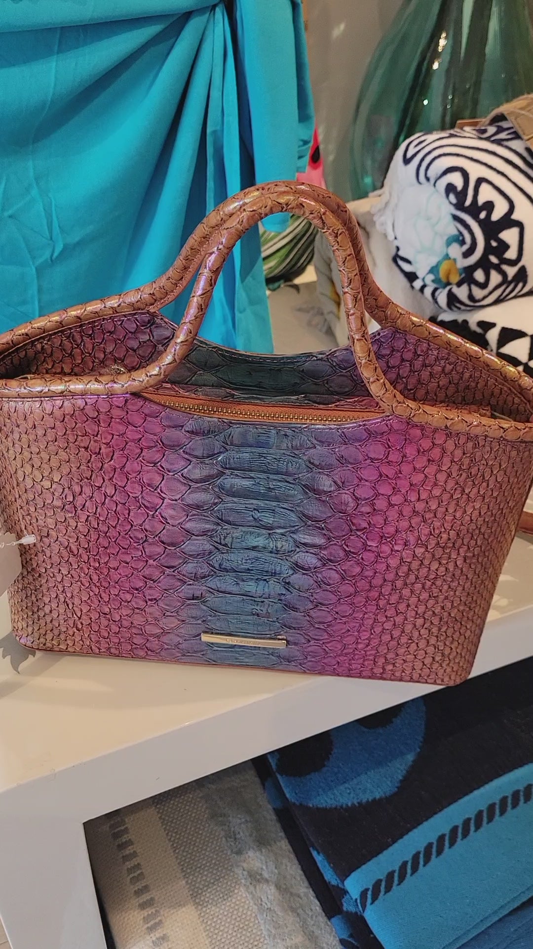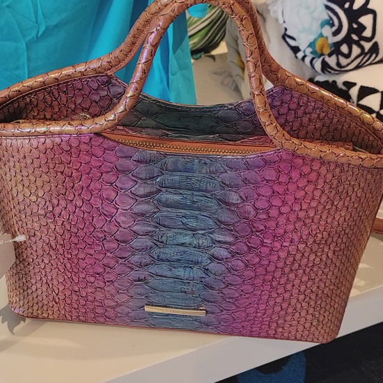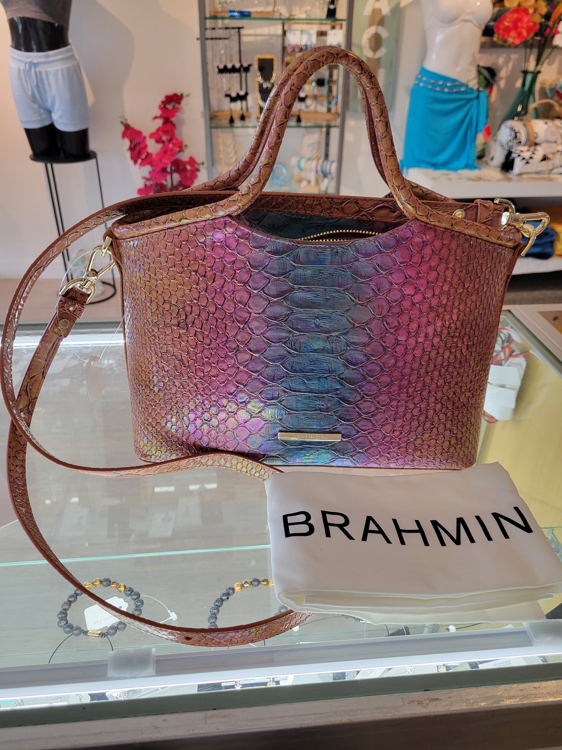 Beautiful genuine leather stylish BRAHMIN ELAINE STELLARIS MULTI SATCHEL BAG. Stunning crocodile embossed pattern. Amazing iridescent ombre rainbow coloring with natural camel accents. Zip closure top. Removable, adjustable 25" crossbody strap and 3.5" double attached rolled handles. Key clip, pen pocket. Interior zip pocket and organizer pocket. Stud feet on the bottom. Certificate of authenticity and dust cover bag included.